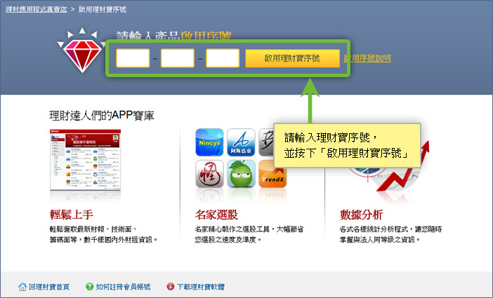 若您已於書籍或財經部落客網站上,取得某理財寶產品序號,您必須完成以下開通程序,才能開始使用該理財寶。